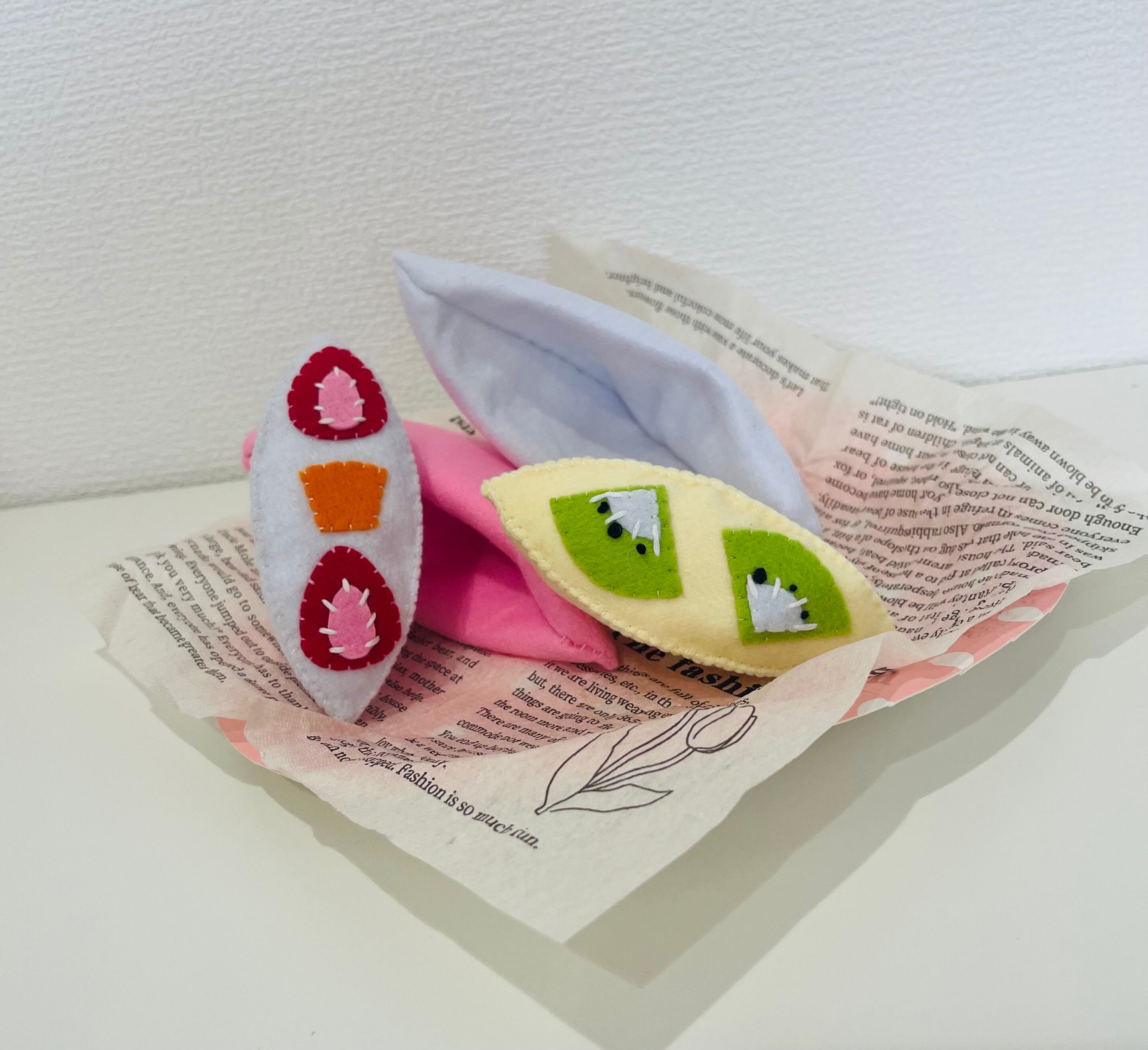 ふわふわ手ざわりのフェルトで作った、カラフルでかわいいフルーツサンドのおもちゃです。